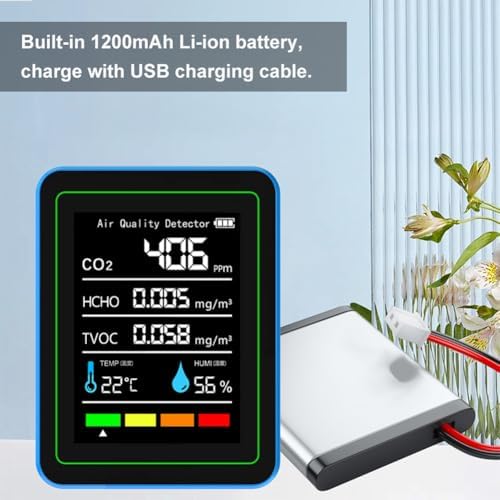 - 5 in 1 indoor air quality :monitor it tracks carbon dioxide (CO2), formaldehyde (HCHO), volatile organic compounds (TVOC), temperature and humidity, helping you stay aware of air quality and potential health risks.