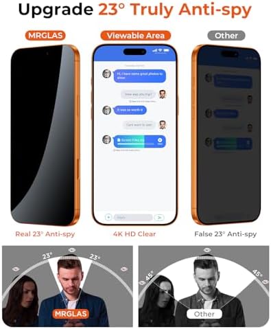 - 【Top Privacy Performance with Industry-Leading 23° Ultra-Narrow Privacy Angle】 MRGLAS takes privacy to the next level with its innovative 23° ultra-narrow privacy angle, a first in the industry. Unlike other privacy screen protectors that offer broader angles, MRGLAS ensures that only you can see what's on your iPhone 17 Pro Max screen, keeping prying eyes out with a 130° anti-peep coverage. Whether you’re on a crowded train, at a café, or in the office, your screen content stays private. Plus, with our Ultra-HD technology, you get unparalleled clarity and brightness, making your screen appear clearer and sharper than ever—even under privacy protection.
