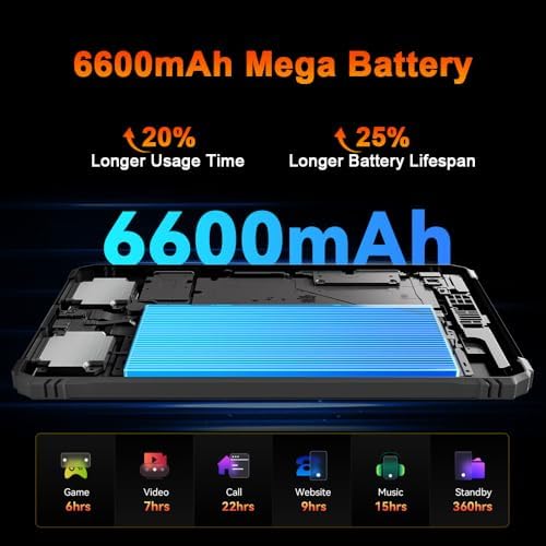 - 🔋【6600mAh Large Battery Tablet + OTG】Designed for endurance, the Blackview ACTIVE 5 outdoor tablet is equipped with a high-capacity 6600mAh battery featuring AI-optimized power management and fast charging, delivering up to 22 hours of voice calls, 15 hours of music playback, and 7 hours of video streaming. It offers an exceptional 360 hours of standby time and remains reliably cool under heavy usage thanks to its advanced cooling system, making it the perfect companion for extended outdoor adventure.