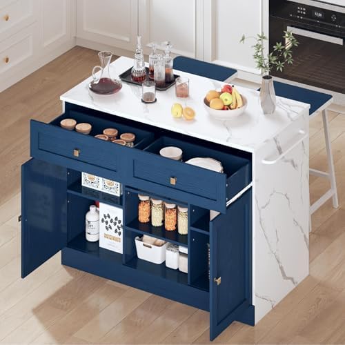 YITAHOME 3 Piece Kitchen Island Set with 2 Chairs, Large Kitchen Island with Seating and Storage, Dining Counter Table with Power Outlet, Drawers, Spice/Towel Rack, White Marble Finish, Navy Blue