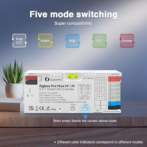 GLEDOPTO ZigBee 3.0 LED Strip Light Controller Pro Max 5 in 1 RGBCCT RGBW RGB CCT WWCW Dimmer Monochrome RGB Color White Light Mix PWM Dimming 20A Pluggable Fuse App Voice Control for Analog LED Strip Light (ZigBee Hub Require)