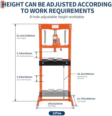 - 12-Ton Capacity:Built-In Safety Overload Protection, Equipped with an overload protection system, this press prevents excessive pressure to safeguard the machine and your workpieces. Enjoy added peace of mind and safety during every pressing and repair task.