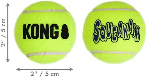 The KONG Squeakair Ball combines two classic dog toys - the tennis ball and the squeaker toy - to create the perfect fetch toy. Our durable, high-quality Squeakair tennis ball will not wear down your dog's teeth. It's made with a special non-abrasive felt, compared to the abrasive material on normal tennis balls.