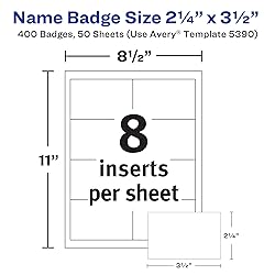 - Quickly and easily create professional name tags from the convenience of your home or workplace with Avery 5390 name badge inserts. This refill pack of 400 blank name tag inserts is perfect for creating personalized name badges for company meetings, conferences, trade shows, and other professional gatherings, as well as class reunions, wedding showers, baby showers, and other social events. Importing names, job titles, and company logos is fast and easy with Avery Design & Print Online. Our easy-to-use software offers hundreds of available Avery templates and designs to help you create professional-quality name tags and ID badges in no time. Try it out today! The 8.5" x 11" insert sheets are optimized for both laser and inkjet printers and are micro-perforated for clean and easy separation. Make a great first impression at your next event with these customizable name tag inserts designed to fit Avery Badge Holders 74549, 74461, 74652, 74651, 74457, and other name badges up to 3” x 4”. This item comes with 50 printable 8.5” x 11” sheets (8 badges per sheet), for a total of 400 2.25" x 3.5" Avery name tags.