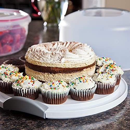 The Sterilite Cake Server is designed to store, transport and serve cakes and desserts for special occasions and parties. This circular cake serving container features an easy-to-clean surface and is perfect for taking your favorite desserts and baked treats on-the-go. The 2 tight-clasping latches hold the lid securely to the base to maintain freshness, and a handle on the lid allows for comfortable carrying to ensure dependable transportation. This server accommodates a 12" round cake and is BPA-free and phthalate-free to ensure your stored foods are fresh, safe and healthy for you and your party guests to enjoy. The overall assembled dimensions of this item are 13 7/8" L x 13 5/8" W x 8" H.