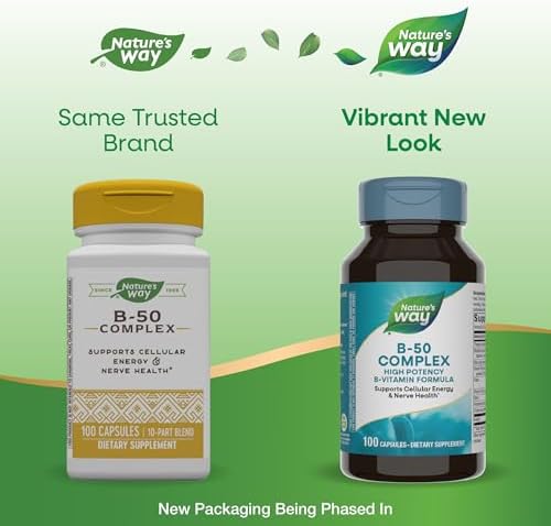 Nature's Way B-50 Complex, Supports Cellular Energy & Nerve Health*, 8 B-Vitamins, With Folic Acid, Biotin, Niacin & More, Gluten Free, 100 Capsules (Packaging May Vary)