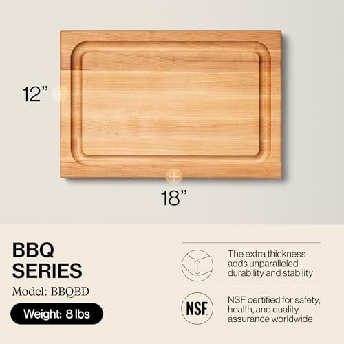 John Boos BBQ Series Rectangular Wooden Maple Cutting Board 18”x12” – 1.5” Thick, 8.5-lb Reversible Butcher Block with Juice Groove, Edge-Grain & Finger Grips– Made in the USA