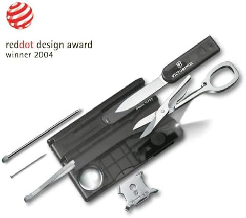 Esta Swisscard Lite fue fabricada por Victorinox. Esta serie Swisscard se distingue por su LED blanco integrado, que le permitirá encontrar fácilmente su llavero o abrir una cerradura en la noche. Se presenta en diferentes tonos: rojo translúcido, antracita translúcido o azul translúcido. Esta gama incluye 13 funciones adornadas con 8 piezas oficiales: una tijera, una cuchilla cortadora, un pinza, una pluma a presión, una pinza, una lupa, un destornillador quattro con - un destornillador de 3 mm, un destornillador de 5 mm, un destornillador 00-0, un destornillador de 1-2, una luz LED, una regla en cm y una regla en pulgadas