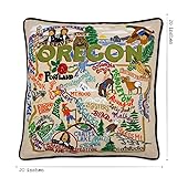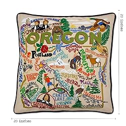 - Wow! From the Rogue River to Round-Up to the Columbia River Crater Lake - this original design celebrates the beautiful State of Oregon! Go Ducks! Go Beavers! This pillow is entirely EMBROIDERED by HAND on 100% Organic Cotton. Amazingly, it can take up to one week to embroider one pillow! It is also unique in nature since each artisan incorporates a certain flair to their work, and every piece is signed on the tag. Created on tea-colored background, accented with black velvet piping, and finished with a 3-button closure. 20 x 20 inches. Geography Hand-Embroidered Pillows Theres always that person who is the best gift giver at every party or holiday. Their gift is personal, thoughtful, and meaningful - adding smiles, laughter, stories, and memories. Since our hand embroidered pillows are the best gifts ever, you can become the best gift giver ever! TREASURED: Want that priceless smile from your gift recipient knowing that you just gave the perfect gift. This is it. Ideal for all of lifes celebrations: Holidays, Weddings, Graduation, Fall Decor ideas, Mothers Day, Fathers Day, Back-to-School, or simply just because. We guarantee this pillow will bring an avalanche of appreciation. MVP: From vintage to modern, farmhouse to retro, cottage to mansion, coastal to chalet chic, our pillows will feel right at home in any design setting or aesthetic. Your sofa, chair, bench, or bed will thank you. It's a unisex gift, that's meaningful for any age. HANDMADE HEIRLOOM: Each pillow is hand-embroidered (yes, embroidered by hand) and takes about a week to make just one. The signature of each artist is included on the tag. Be the proud owner of a one-of-a-kind, piece of art - an heirloom to be enjoyed for generations to come. ORIGINAL ARTWORK: Each design is HAND-DRAWN and created with an insiders perspective, taking even the smallest details to heart.