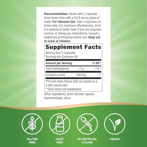 - Gluten-free and vegan cranberry capsules for urinary tract health*; no salt, wheat, soy, corn, dairy, gelatin, or artificial colors, flavors, or preservatives; Non-GMO Project Verified