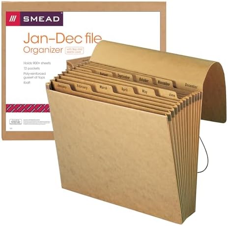 The perfect solution for organization you can take with you, Smead’s Kraft Expanding File is designed to help you organize large amounts of paperwork that need to be transported quickly or file material without a file cabinet. Includes one letter size (12" W x 10" H) expanding file with a protective flap, an elastic cord closure and 12 pockets with monthly (January-December) indexing. Kraft stock provides a professional appearance, making this expanding file a recognizable favorite for easy filing and organizing. A sturdy flap with an elastic cord closure adds protection and security, allowing you to confidently carry your documents with you wherever you go. Full-height gussets reinforced with clear poly tape at the top provide increased durability, along with double-thick front and back panels with heavy reinforcement liner board. Kraft dividers with monthly (Jan.-Dec.) tabs create 12 interior pockets, each with a 7/8" expansion capacity for ample storage. Proudly made in the USA. Contains 10% recycled content, 10% post-consumer material and is SFI Sourcing Certified. Choose from alphabetic (A-Z), monthly (Jan. - Dec.) or daily (1-31) indexing.