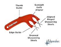 EDGEMAKER PROFESSIONAL SHARPENING TOOL- 331 allows you to both hone and sharpen the toughest of knives. This hand held sharpener works on wavy and serrated knives too TOUCH UP YOUR KNIFE BLADES QUICKLY AND EASILY IN ONE PORTABLE TOOL, the Edgemaker Pro hones and sharpens blades in less than one minute, performs like Butcher’s Steel leaving behind a smooth strong blade. Bring your dull blades back to life! HOW THEY WORK- All Edgemaker Tools work the same way. Simply draw the knife through the crossed steels with mild pressure. Read all Safety information before use SAFE, DURABLE & LONG LASTING- including an unbreakable high impact plastic handle. Steels can be pulled out and rotated to provide new sharpening surface for years of use. Simply place sharpener in hot water for one minute to expand plastic, pull steels, rotate, and then reinsert SAFETY FIRST- read all directions on the back of the packaging, including best practices, and step by step instructions on how to get the best results