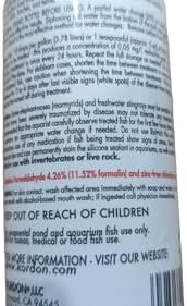 37644 Capacity: 4 fl. oz. Features: -Rid ich medication.-Will not harm biological filters when used as directed.-For fresh and saltwater home and non-food fish aquariums andponds.-The foremost ich white spot chemical treatment for aquarium and pond fish.-Made in the USA. Dimensions: -4 fl. oz.: 4" H x 1.5" W x 1.5" D, 0.3 lbs - Treats 240 gallons.-1 gal.: 12" H x 8" W x 8" D, 8.9 lbs - Treats 7,693 gallons.