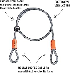 DURABLE DESIGN: This Anti-Theft double loop cable lock is made from 10mm BRAIDED STEEL CABLE for greater cut resistance. A protective vinyl coating helps prevent scrathing and wear and tear on your bike/equipment. MULTI-FUNCTIONAL: This 30ft long cable can be used with all Kryptonite U-Locks, disc locks and padlocks. When paired with a second Kryptonite lock, the 410 Double Looped Cable is ideal for securing multiple bicycles, motorcycles, or scooters. It is also ideal for securing outdoor equipment, patio furniture, or other heavy equipment. SPECIFICATIONS: This double loop cable lock is 4 ft. (120 cm) long and 3/8 in. (10 mm) wide in diameter and weighs .70 lbs (.32 Kgs). LIFETIME WARRANTY AND CUSTOMER SERVICE: Kryptonite is committed to providing our customers with high quality products, ensuring full satisfaction. If you are experiencing any problems with your product, please reach out to our Customer Experience team. We will work to solve your issue as quickly as possible. We provide our locks with a limited lifetime warranty so you can buy your lock with confidence.