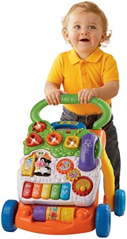 From baby steps to big steps the Sit-to-Stand Learning Walker by VTech helps your baby develop from a crawler to a walker through adaptive technology. With a barnyard of playful friends to cheer them on, your little one will have endless fun as they learn to walk. Start out with the easy-to-remove activity panel for floor play or on-the-run fun, then step it up with the fun-to-maneuver walker. Spinning gears, five piano keys, three colorful rollers, three light-up shape sorters, three light-up buttons and a telephone handset offers endless fun that will stimulate your baby’s learning and develop their motor skills. The Sit-to-Stand Learning Walker keeps baby on track teaching shapes, colors, animals, music and more!