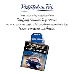 TEA TIME ANY TIME: Start your morning with English Teatime as a coffee alternative. It's a bold, full bodied tea with a smooth finish. Add honey, milk, or enjoy iced. INDIVIDUALLY WRAPPED: Bigelow tea always come individually wrapped in foil pouches for peak flavor, freshness and aroma to enjoy everywhere you go! Gluten -free, calorie-free, & Kosher certified. TRY EVERY FLAVOR: There's a tea for morning, noon & night time relaxation. Try our English Breakfast, Vanilla Chai, antioxidant Green Tea, decaffeinated, organic teas & a variety of our herbal tea bags. AMERICAN MADE TEA: In 1945 Ruth Bigelow created our first tea, Constant Comment, a flavorful black tea blended with aromatic orange peel & warming spices. Today, Bigelow is still family owned and American made. BIGELOW TEA: Since 1945, Bigelow has been a leader in premium tea & are proud to be a Certified B Corporation - meeting the highest verified standards of social & environmental performance, transparency & accountability. 20-count boxes of calorie-free tea Rich black tea, invigorating in the best English tradition Gluten free, with no calories and no carbohydrates; Kosher Parve An excellent source of healthy antioxidants Blended and packaged in the U.S.A.
