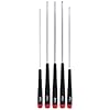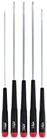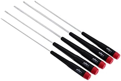 Wiha 26192 slotted and Phillips five piece extra long precision screwdriver set. Slotted 2.5 x 150mm, 3.0 x 150mm, 4.0 x 150mm. Phillips 0 x 150mm,1 x 150mm. Exact fit precision machined tips. Wiha high performance CRM72 tool steel blades. Through hardened for optimum torque performance micron vapor hard chromed finish. Handles proportioned to blade size slim and tapered. Finger control cap for precise turning.