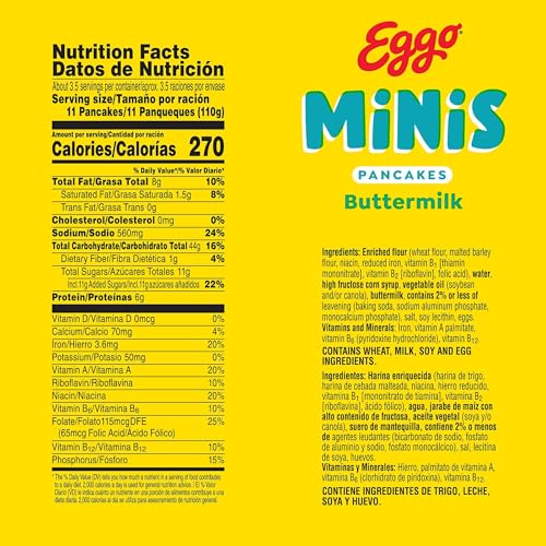 Despiértese y dé la bienvenida al día con el delicioso sabor de las tortitas Eggo Minis. Incluye una caja de 14.1 onzas que contiene 40 minitortitas. Prácticos y fáciles de preparar, los panqueques Eggo Minis aportan calidez a las ajetreadas mañanas. Ideales para familias y personas, estas deliciosas tortitas están preparadas para disfrutarlas como un desayuno independiente o con sus ingredientes favoritos de la mañana, como mantequilla y sirope, jaleas y conservas y crema batida. Sin colorantes ni sabores artificiales, nuestros Minis Pancakes también son una buena fuente de 8 vitaminas y minerales. ¡Tan deliciosos que no puedes comer L'Eggo!