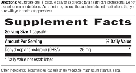 - DHEA for Healthy Aging & Hormonal Support: Formulated with 25 mg of pure DHEA per capsule to help support natural hormone levels that decline with age—promoting graceful aging, sexual wellness, and overall hormonal balance in adults.*