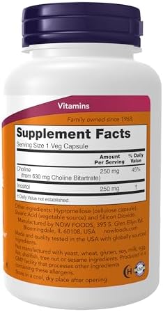 NOW Supplements, 500 mg de colina e inositol, transmisión nerviosa saludable*, salud del sistema nervioso*, 100 cápsulas