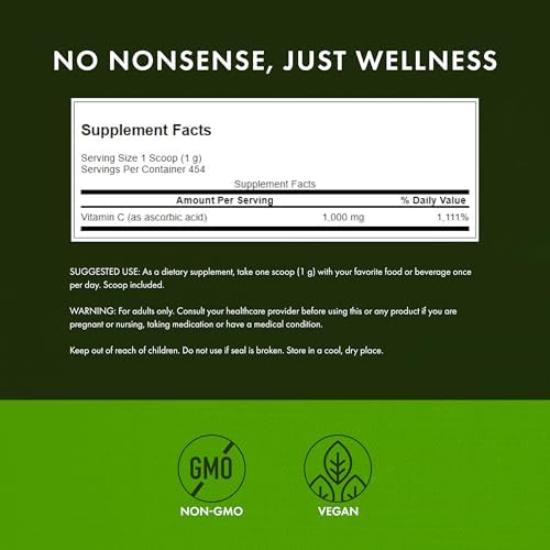 Swanson Vitamin C Powder 100% Pure Ascorbic Acid, Immune System Support, Skin Health, Cardiovascular Health, Antioxidant Supplement 1000 mg (per Serving) 1 lb. 454 g