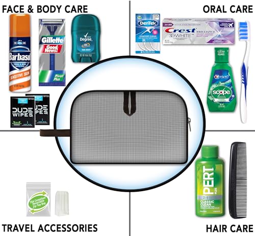 Barbasol Shave Cream 2 oz., Pert Plus 2in1 Shampoo+Conditioner 1.7 oz., Degree for Men A/P Deodorant .5 oz., Scope Mouthwash 1.2 oz., Crest Toothpaste .85 oz., Full Size Toothbrush, Toothbrush Cover, Comb, Gillette Good News Disposable Twin Blade Razor, TSA Compliant Quart Size Zip Top Bag, Black Mesh Bag.