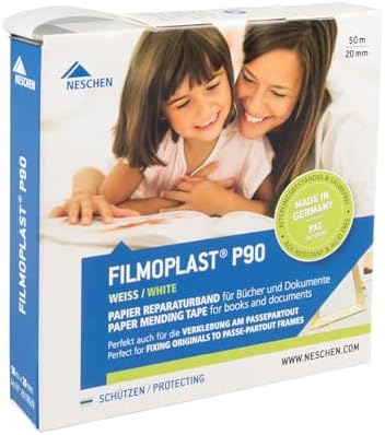 - Rollo de Fimoplast P 90 de 50 m x 2 cm en dispensador de papel especial de fibra larga, extra blanco y opaco. Diseñado para reparar o reforzar bisagras. Ensamblaje protector y reparación del fondo antes de coser.