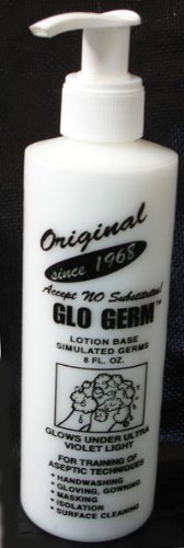 - Glo Germ Mini Kit Introducing the new Mini Glo Germ kit. The mini kit is a disposable kit designed to teach up to 25 people proper handwashing. Great idea for teaching smaller groups or a onetime training. The mini kit contains 1 - 2oz bottle of gel a ultra-violet Keychain Light OR ultra-violet Pen Light informative Trainers Manual. In order to use the Keychain light, just squeeze the purple center in one hand. While bracing the silver part against your other hand, slide the purple part forward until it locks in place. Light will stay on as long as it is locked in place. The Glo Germ products demonstrate germ communication, cross-contamination, effectiveness of sanitary practices, and more! Illuminate the weaknesses in your techniques with Glo Germ and protect yourself, your customers, and your bottom line! In this age of concern over infectious diseases, security, and liability, Glo Germ is an effective tool to demonstrate handwashing, surface cleaning, hygiene, and containment techniques. It is a big mistake to assume that your employees understand the critical nature of these simple processes. You have to teach them! Not enough can be said about the importance of cleanliness, proper handwashing and infection control. Since 1968, Glo Germ has provided customers with a fun and safe product that casts a revealing glow when exposed to Glo Germ’s U.V. light, turning the invisible into germs you can see!