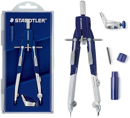 Elevate your drafting and geometry work with this 6" metal compass set (552 01) from STAEDTLER. The quick-setting push-button mechanism and center wheel ensure precise circle drawing up to 350mm diameter. Ideal for technical drafting, and geometry applications, this durable metal compass features hinged lead and needle legs with interchangeable components. The compass set includes a universal adapter, spare needle, and additional leads, all housed in a protective hard plastic case. Essential for students and practitioners seeking reliable drafting tools for technical drawings and geometric constructions.