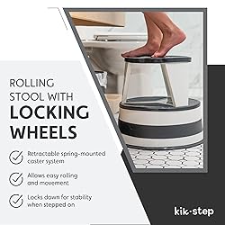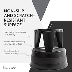- "The all-steel Kik-Step provides firm footing 14-1/2" off the floor. Hidden, spring-loaded casters allow the Kik-Step to roll easily, and then automatically retract when the Kik-Step is stepped on to provide a nonslip step. Wraparound vinyl bumpers protect walls and furniture. Step stool features nonskid vinyl treads and a 350 lb. capacity. CRA100192 Original Kik-Step Steel Step Stool, 15-5/8 dia. x 14h, 350 pounds Duty Rating, Black Spring-mounted casters retract when stool is stepped on. Steel construction with nonslip vinyl treads and protective bumper around base. Ships in two pieces and requires no tools for assembly."