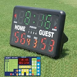 - Players, coaches and fans all look to the scoreboard for important information when the competition is heating up. With the Indoor/Outdoor Tabletop Scoreboard with Remote Control, everyone will be able to see the score, period and how much time remains, so players and fans can easily track the game's progress. With adjustable LED brightness, the scoreboard can be used in the gym or out on the field, with a game clock keeping track of remaining time in bright green numbers. Coaches and referees can update the score and start or stop the clock easily with the included remote control. LED display has dual settings for clarity in lighter or darker environmentsCan be used as a timer, stopwatch or clock with alarm capabilitiesDisplays two scores with a game clock, period indicator, bonus markers and foul trackingDesigned for portable use with a rechargeable battery that lasts up to six hours, depending on the level of brightness being usedRemote control operates the scoreboard from a distance to keep it updated