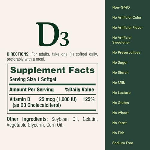 • HUESOS FUERTES Y SALUDABLES (1): Obtener suficiente Vitamina D es crítico para la absorción de calcio, lo cual ayuda a los adultos a construir y mantener huesos saludables. (1) Además de apoyar huesos fuertes, las cápsulas suaves de Vitamina D3 de Nature’s Bounty complementan la Vitamina D que tu cuerpo necesita para la salud general (1)