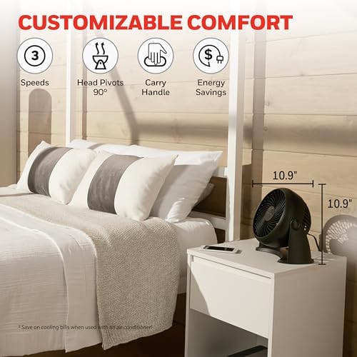 Diseño Aerodinámico TurboForce para máxima circulación del aire. Úsalo para un enfriamiento personal intenso o para una circulación de aire que ahorra energía. 25% más silencioso que modelos similares. Dimensiones - Longitud: 11.10 pulgadas, Ancho: 6.54 pulgadas, Altura: 11.30 pulgadas. Puede usarse en una mesa o montarse en la pared para mayor comodidad. Recomendado para habitaciones pequeñas y medianas. Marco de 11 pulgadas que pivota 90 grados con 3 velocidades y aspas de 7 pulgadas.