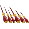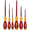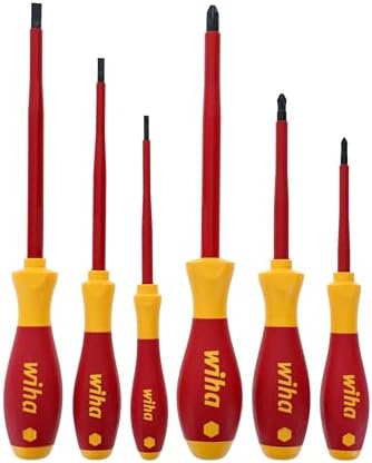Conjunto de destornilladores aislados Wiha 32092 de seis piezas con clasificación de 1000 voltios y mango SoftFinish. El mango SoftFinish tiene un núcleo moldeado sólido con un agarre exterior acolchado suave y tiene un 40 por ciento más de torque que los mangos convencionales. El aislamiento está moldeado directamente en la hoja para una unión permanente. La hoja está fabricada en acero herramienta CVM, endurecido a un promedio de 58/60RC. Cumple con los estándares de prueba de aislamiento IEC 900, ASTM F-1505-01, Nuevo VDE 0682/parte 201, DIN 7437. Responde a la especificación de uso OSHA 29 CFR1910. El conjunto de seis piezas incluye ranura 3.5, 4.5 y 6.5mm. Phillips 1, 2 y 3.