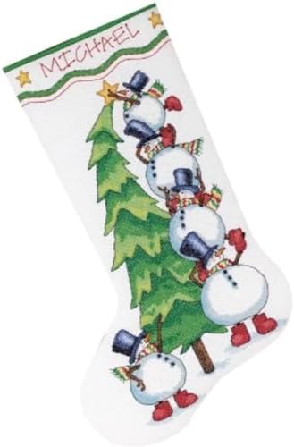 This year, hang a homemade Christmas stocking above the fireplace! The Dimensions Counted Cross Stitch Trimming the Tree Personalized Christmas Stocking Kit features five jolly snowman working together to place a star on their Christmas tree! Personalize this Christmas craft by stitching the name of a child, friend, or loved one above the cute Christmas scene! Christmas cross stitch stocking kit includes 14 count white Aida, wool yarn, cotton thread, stitching needle, and easy to follow instructions. Completed kit measures 16'' long.