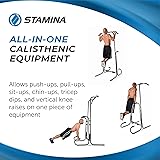 STAMINA POWER TOWER - Our Power Tower provides a total body workout, suitable for body strengthening, build and tone muscles, and to lose weight. This pull up bar station improves your figure, posture, mobility, balance, and overall fitness health. ALL-IN-ONE CALISTHENIC EQUIPMENT - This versatile dip station offers different workout possibilities. This power tower is suitable for strength training, targeting specific muscle groups without the use of weights, and toning the muscular core. STABLE AND COMFORTABLE - This pull up bar station includes secure foam hand grips at each exercise station that provide stability and comfort during exercise. The durable steel frame of this free standing pull up bar supports users of up to 250 lbs. SPACE SAVING DESIGN - This compact dip bar tower is designed for easy storage and is ideal for users with limited space. Our pull up bar provides multiple workout stations that fit easily in any indoor or garage space. SMART WORKOUT APP - Experience connected fitness with this home gym equipment with the müüv app. With smart guided coaching, exercise demo videos, personalized workouts, assembly videos, and more, müüv provides the best workout and fitness experience with your Stamina Pull Up Bar.