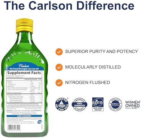 - SALUD DEL CORAZÓN, EL CEREBRO Y LAS ARTICULACIONES - Una cucharadita de aceite de hígado de tiburón Carlson proporciona 1,100 mg de omega-3, incluyendo EPA y DHA, que apoyan la salud del corazón, cerebro, visión y articulaciones. Para garantizar la máxima frescura, el aceite de hígado de tiburón es gestionado de cerca desde el mar hasta la tienda.