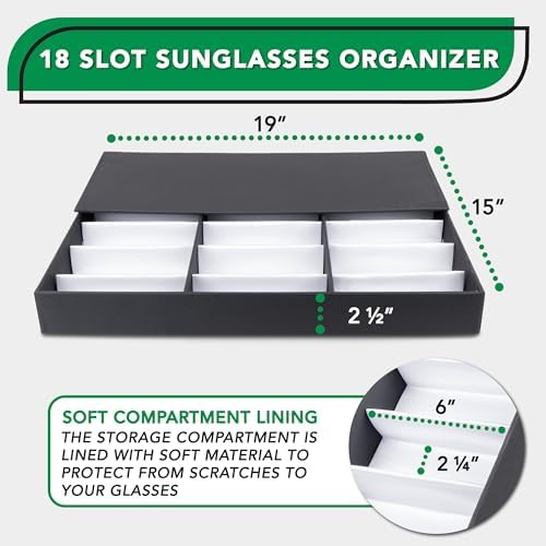 • FITS MOST – All 18 slots that measure 6”L x 2.25”W x 2.25”H and fit most sunglasses and watch sizes without extra space for items to slide around. Each slot is deep enough to prevent your items from poking out and unable to close the lid for storage.