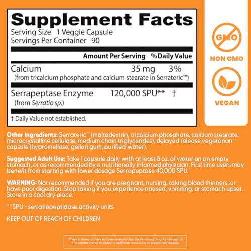 - ALTA POTENCIA - 120,000 Unidades de Serratiopeptidasa (SPU) en cada cápsula. Tome 1 cápsula diaria con agua con el estómago vacío. Sin gluten, No-GMO, Vegano. Doctor's Best está comprometido con la seguridad de todos nuestros productos.*
