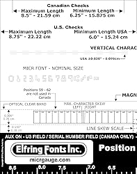 - A MICR gauge lets you quickly and easily verify that all the data on your check is accurately printed in the proper positions. A MICR check position gauge is a clear plastic template that you position over your check. It indicates whether or not your MICR encoding line follows the correct spacing, is skewed, and has the right number of characters. The MICR gauge also shows you the magnetic clear zone plus maximum and minimum check heights and widths. It now includes a decimal inch ruler plus a printed manual. You can verify 13 different check standards with this gauge. Measurements for items 1 - 6 are made by positioning the gauge over the check so that the check's bottom and right edges align with the black bottom area and right edge of the MICR gauge. Measurements for items 7 - 13 require moving the gauge around on the check. This gauge works for both US and Canadian checks. All U.S. specifications are measured in inches. All Canadian specifications are measured in centimeters (cm). MICR printing is right justified. Most MICR measurements are specified from the bottom right corner of your check. This MICR check position gauge is the easiest and most complete gauge on the market. The bottom of the MICR gauge is are glued below the guide line. You can NOT glue the gauge to the backer board at the exact edge of the black guide line. If you did when you inserted a check the check would not reach the guide line, since it has to bend the plastic gauge surface up. The thickness of check paper can vary by a factor of 4 to 1. So a gauge that works for your checks, won't work for a company that uses thicker check paper. In addition, a gauge that works for your checks in the winter, (when there is little moisture in the air), will not work for your checks in the summer (when moisture swells your check paper up by 25%). So you must align the bottom edge of your check with the gauge.