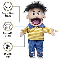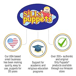 High quality moving mouth hand puppet made by Silly Puppets. Designed for children but will fit most adult size hands. Easy to move mouth and arms. Hand entry through the bottom of the puppet. Height is about 14 inches tall. Lightweight at only 8 ounces. Beautifully made and detailed clothes are removable.