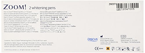 Zoom Pens are an easy to use whitening system that uses a pen-like applicator to whiten your teeth without a mess. It's the perfect product to whiten your teeth wherever and whenever you want.Features:Two applications per day for two weeksApproximately 30 days of applications per penEasy to use click pen applicatorTime released proprietary formulaDries rapidlyDiscus Dental Zoom Whitening PensA convenient and new way to maintain your whitened smile! Easy to use, click-pen can be taken anywhere. Two applications a day will help keep smiles looking great.Ingredients: Water, hydrogen peroxide, carbomer, glycerin, PEG-60 hydrogenated caster oil, PVP, ammonium hydroxide, flavor, sodium saccharin, etidronic acid, potassium stannate.Instructions for Use The Zoom! Whitening Pen is for whitening of natural teeth only.Remove cap from the Zoom! Whitening Pen.Refresh the brush tip by clicking the pen button at the opposite end, until a small droplet of gel appears in the brush. You may have to click the pen 10-15 times the first time you use it.Apply a thin layer of gel directly onto the front surfaces of the teeth.Replace the cap when you’re finished.The Zoom! Whitening Pen can be used day or night, and requires no waiting after application. Apply to teeth twice daily for best results. Just apply to your teeth and go!The Zoom! Whitening Pen is an easy way to maintain your Zoom!! smile at work, or home, or on the go. The Zoom! Whitening Pen is not a substitute for regular dental care. Please visit your dentist regularly. The Zoom! Whitening Pen will not whiten crowns, veneers, fillings or dentures. It is recommended that you don’t eat or drink for 30 minutes after application to ensure The Zoom! Whitening Pen gel has been absorbed.Caution: Keep out of reach of young children. This product is designed for use only by adults and persons 16 years or older. Do not use Zoom! Whitening Pen if you have braces or any other kind of overnight dental appliance. Exp. 6/15
