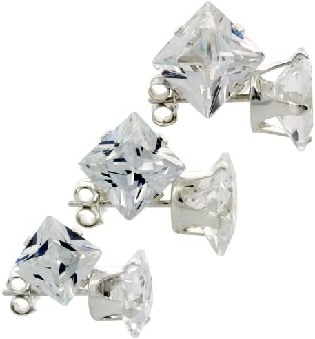 3 Pair Set Sterling Silver Cubic Zirconia Square Earrings Studs 6 7 and 8mm Princess cut