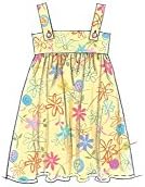 CHILDREN'S AND GIRLS' DRESSES: Pullover, flared dress, above mid-knee has self-lined upper front and back (fitted through the chest), raised waist seam and narrow hem finishing; dresses A, B have front pleats and back elastic; dress A has contrast upper front and back, shoulder straps extend from back and has buttonhole and button closing; dress B has bias upper front and back, bias pocket with pleats and button trim; dresses C, D have shoulder straps with buttonhole and button closing; dress D has patch pocket with pleats and button trim. NOTIONS: Thread; Dress A, B, C, D - Two 1 1/4-Inch Buttons; Dress A, B - also 1/2-yard of 1/4-Inch Wide Elastic; Dress B, D - Two 1-Inch Buttons. SUGGESTED FABRICS: Lightweight Broadcloth, Gingham, Seersucker, Lightweight Denim. Additional Fabric may be needed to match stripes, plaids or one-way design fabric. With Nap, Without Nap, With or Without Nap Combinations: CCE(3-4-5-6), CHJ(7-8-10-12-14)