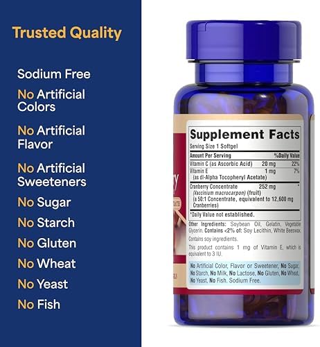 Puritan's Pride Triple Strength Cranberry Concentrate está diseñado para apoyar la salud del sistema urinario e inmunológico.* Cada porción ofrece un potente 252mg de Cranberry Concentrate, de 12,600 mg de fruta de aránda, aprovechando los beneficios conocidos por su capacidad para promover la salud urinaria.* Con proantocianidinas naturales, esta formulación proporciona un apoyo esencial para la función urinaria.* Además, incluye Vitamina C, un poderoso antioxidante que juega un papel clave en el apoyo a la función inmunológica, junto con la Vitamina E, un nutriente esencial para la salud general.* Incorpora los beneficios del Triple Strength Cranberry Concentrate en tu rutina diaria con nuestras convenientes cápsulas blandas. *Estas declaraciones no han sido evaluadas por la Administración de Alimentos y Medicamentos. Este producto no está destinado a diagnosticar, tratar, curar o prevenir ninguna enfermedad.