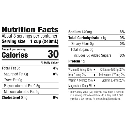 • azúcar, solo 30 calorías: 0 g de azúcar por porción. La leche vegetal sin azúcar sabe muy bien servida sobre cereales o en tus batidos favoritos
