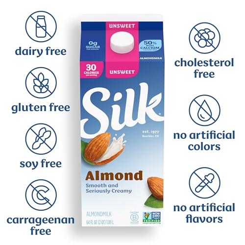 Leche de almendras de seda, sin azúcar, sin lácteos, sin gluten, leche vegana muy cremosa con un 50% más de calcio que la leche de vaca, 64 onzas líquidas (medio galón)