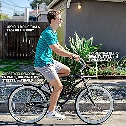 Single speed cruiser bike, great for casual rides around town, by the beach, or throw the neighborhood 19" Frame, 26" Wheels, will fit most adult men 5'5" and above Classic cruiser frame design with oversized dual spring saddle and balloon tires Simple pedal backwards coaster brake makes stoping easy, there's no cable to fuss with Rider sits upright while riding, taking pressure off the back