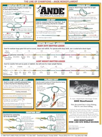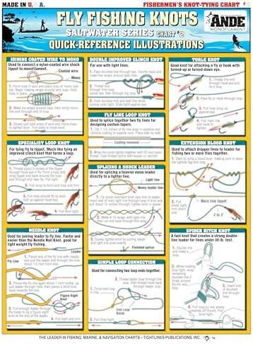 Knot tying chart # 8 ;both novices and Pro's all over the world find something interesting in tight lines charts. All charts are 3mm Laminated to ensure 100% percent waterproofing, and can be rolled up to fit into any tackle box. These charts are very durable. Whether you bend'em or tweek'em, these charts can take it. The hard plastic lamination covering these charts make them built to last. From bait rigging to rules of the road you can't go wrong with a tight lines charts at your helm.This chart contains: joining coated wire to mono, double improved clinch knot, Turle knot, specialist loop knot, fly line loop knot, needle knot, simple loop connection, extension blood knot, splicing a shock leader, spider hitch knot, simplified blood knot, jam knot, custom knotted leaders, fly line loop knot, Palomar knot, Crawford knot.;fishing book/video/audio/charts ;tight line publications;chart describes fly fishing knots: saltwater Series chart #2 3mm Laminated 100% waterproof ;theres nothing like the fishing sport to calm your frazzled nerves or relax on a nice spring day.
