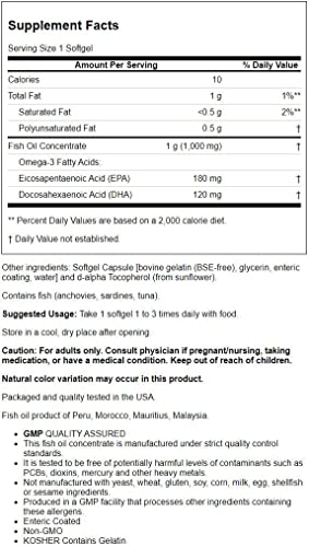 - Molecularly Distilled Odor Controlled - Enteric Coated 180 EPA / 120 DHA Cholesterol-Free Supports Heart Health* A Dietary Supplement